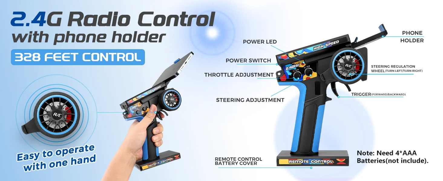 3. 2.4GHz Radio System2.4GHz Radio System with anti-jamming capability allows to race at the same time in the same track. 100 meter control distance, racing freely.